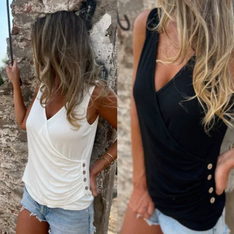 DECORATIVE BUTTONS FOR A TOUCH OF ELEGANCE – Four decorative buttons on the left waist side add an extra flair to the design, elevating this tank top beyond the ordinary. These eye-catching details provide a unique, fashionable twist to a classic design.