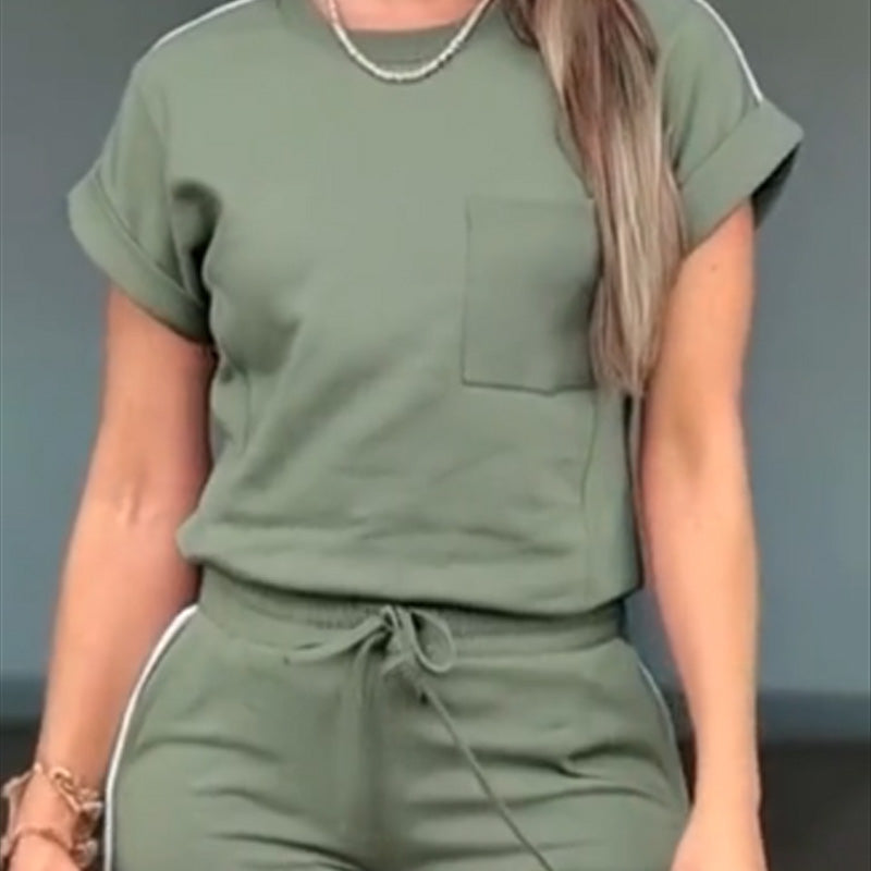 VERSATILE & STYLISH DETAILS - Short-sleeved top with a front pocket and rolled cuffs, paired with sleek jogger-style pants for effortless style.