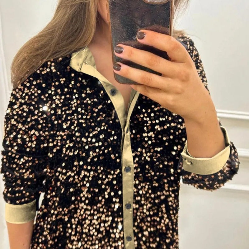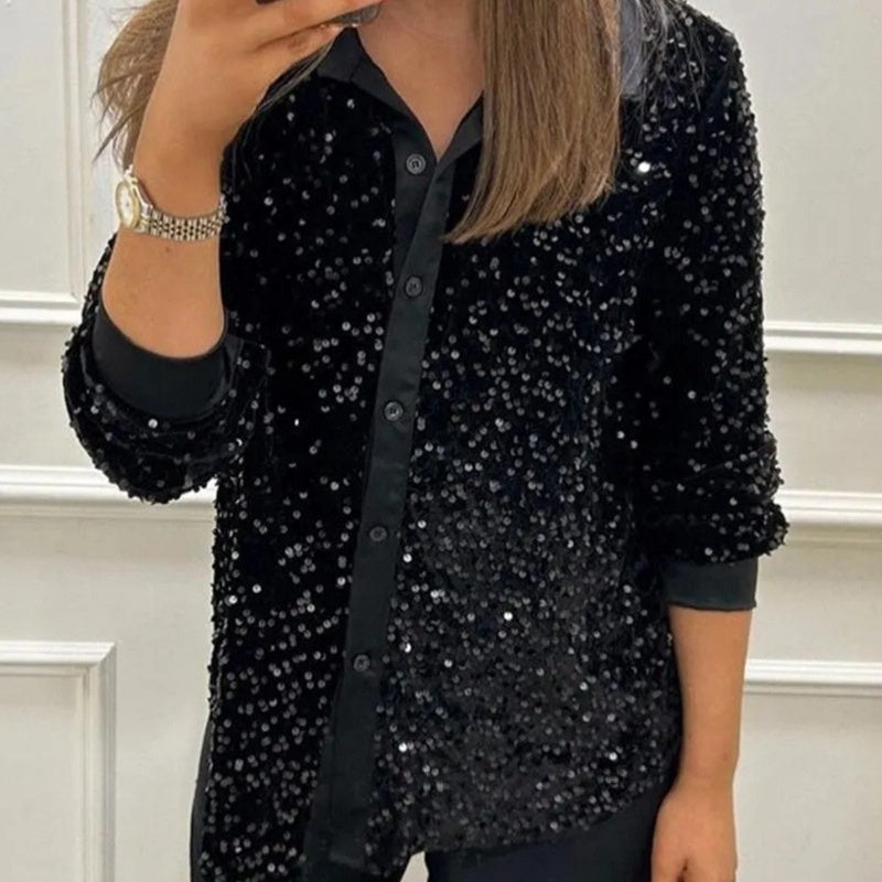 Lapel Design - The lapel design of the sequin top adds a sophisticated, fitted touch that enhances the overall look of the sequin top. This classic yet modern detail helps the shirt transition seamlessly from casual to formal wear.